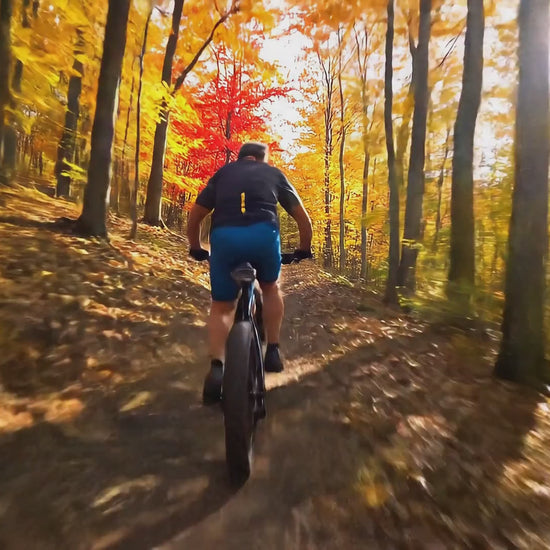 A flash of Fall's iconic colors, captured on a Western PA trail, sparked the design for this mountain bike image. While the original photo was taken on one of my favorite local rides near Pittsburgh, the aesthetic evokes the sweeping vistas of Jake's Rocks and the legendary Allegrippis trails. Autumn in Pennsylvania or any East Coast MTB trail, from October through November, is a breathtaking blaze of color. It's also the unofficial start of fat bike season. East Coast MTB trails become a carpet of fallen leaves, so thick they can completely hide the path beneath them. This is where a fat bike truly shines, its wide tires soaking up the hidden rocks and branches that would otherwise catch you by surprise. After all, as the saying goes, "Fatter is Funner!"